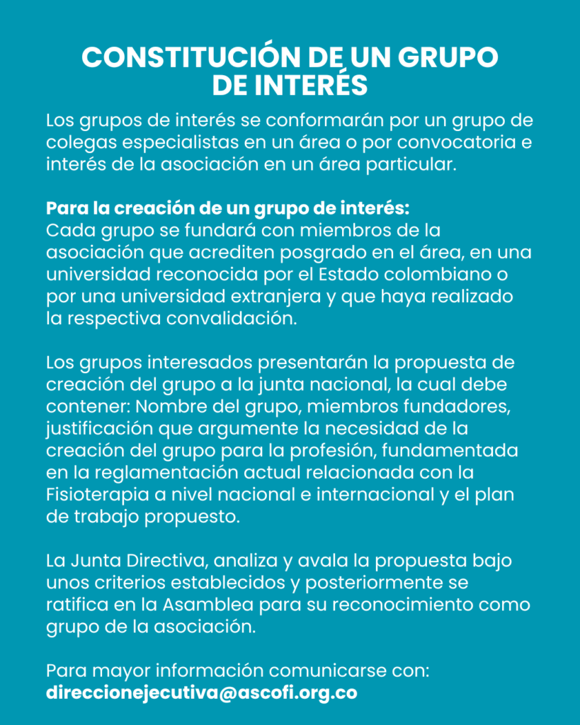 Participar en los Grupos de Interés de ASCOFI es hacer parte de una red que innova, representa y transforma el futuro de la fisioterapia en Colombia.